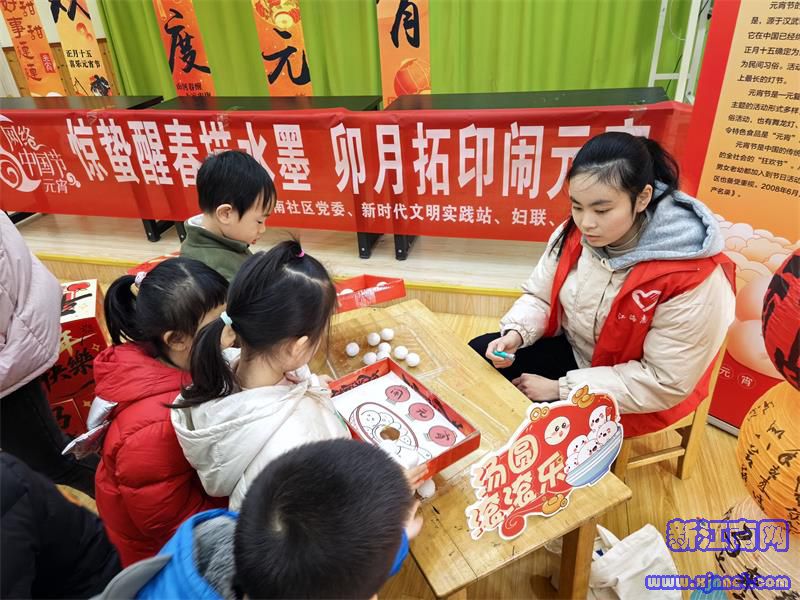 活动现场,孩子们在社区志愿者的带领下,参与了非遗拓染、国风手绘、猜灯谜、钓汤圆等丰富多彩的活动。在手工区,孩子们手持毛笔书写“福”字制成冰箱贴,用墨拓、印泥等将“元宵”“马到成功”等吉祥文字印在红色卡纸上,锻炼了动手能力,也感受到了传统技艺的魅力。猜灯谜区人气最旺,妙趣横生的灯谜内容涵盖了字谜、成语、民俗知识等,孩子们冥思苦想,踊跃抢答,在思考与欢笑中感受中华语言的智慧。“钓汤圆”游戏将活动推向高潮,孩子们手持小钓竿,小心翼翼地从“汤锅”中“钓”出“汤圆”,每成功一次便发出一阵欢呼,以童趣的方式展现了元宵节“吃汤圆,庆团圆”的习俗。