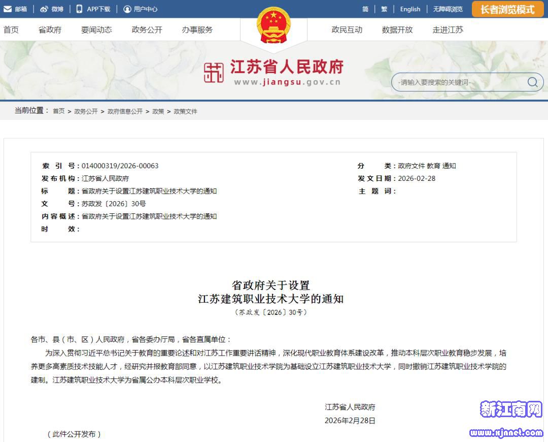 交汇点讯 近日,江苏省人民政府发布《关于设置江苏建筑职业技术大学的通知》,明确以江苏建筑职业技术学院为基础设立江苏建筑职业技术大学。这标志着江苏建筑职业技术学院升格为本科层次职业学校,开启高质量发展新篇章。此前,江苏已设立南京工业职业技术大学、苏州职业技术大学、无锡职业技术大学及扬州职业技术大学4所职业本科院校。