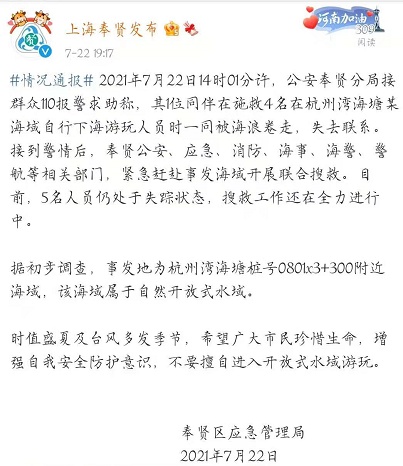 2021年7月22日14时01分许,公安奉贤分局接群众110报警求助称,其1位同伴在施救4名在杭州湾海塘某海域自行下海游玩人员时一同被海浪卷走,失去联系。接到警情后,奉贤公安、应急、消防、海事、海警、警航等相关部门,紧急赶赴事发海域开展联合搜救。目前,5名人员仍处于失踪状态,搜救工作还在全力进行中。