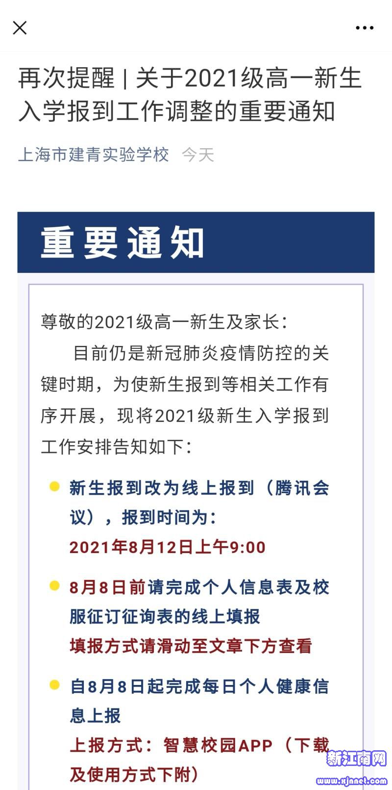 昨天、今天两日,建青实验学校官微连续发布提醒,就2021级高一新生入学报到工作调整发出重要通知。2021级高一新生报到改为线上报到(腾讯会议),报到时间为8月12日上午9:00。