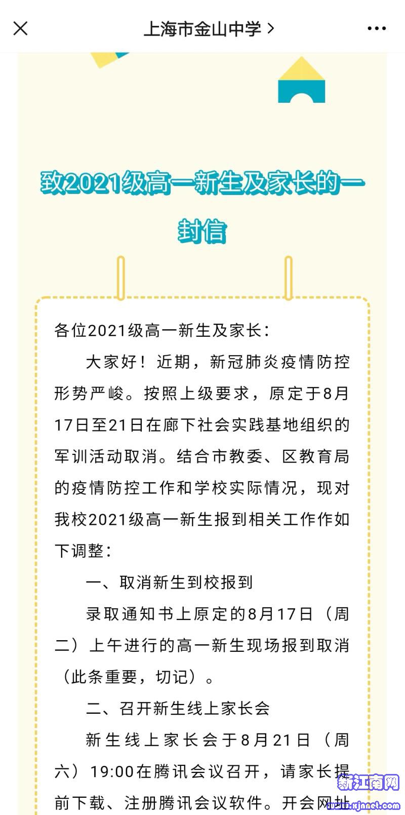 昨天(8月6日),金山中学官微发布“致2021级高一新生及家长的一封信”,其中写道:原定于8月17日至21日在廊下社会实践基地组织的军训活动取消。同时对学校2021级高一新生报到相关工作作出调整:录取通知书上原定的8月17日(周二)上午进行的高一新生现场报到取消。召开新生线上家长会,于8月21日(周六)19:00在腾讯会议召开,请家长提前下载、注册腾讯会议软件。
