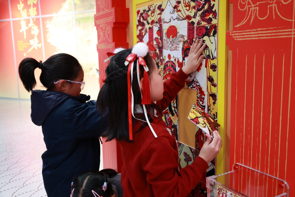 走出学术气息浓郁的主展区,“春节主题造景区”以丰富的互动场景吸引观众。 “猜腊八粥料”将不同杂粮做成实物拼图,观众可以拼出一份自己喜欢的腊八粥;“送灶王”场景将灶王爷设计成憨态可掬的卡通形象,邀请观众打卡留念;“扎老虎柏子花”里,观众可体验现场用柏叶、红果等材料制作仿生花;“抽福卡”“年画拓印”“接财神”“走三桥”等趣味互动装置,让市民在亲身体验中重拾地道上海年味。