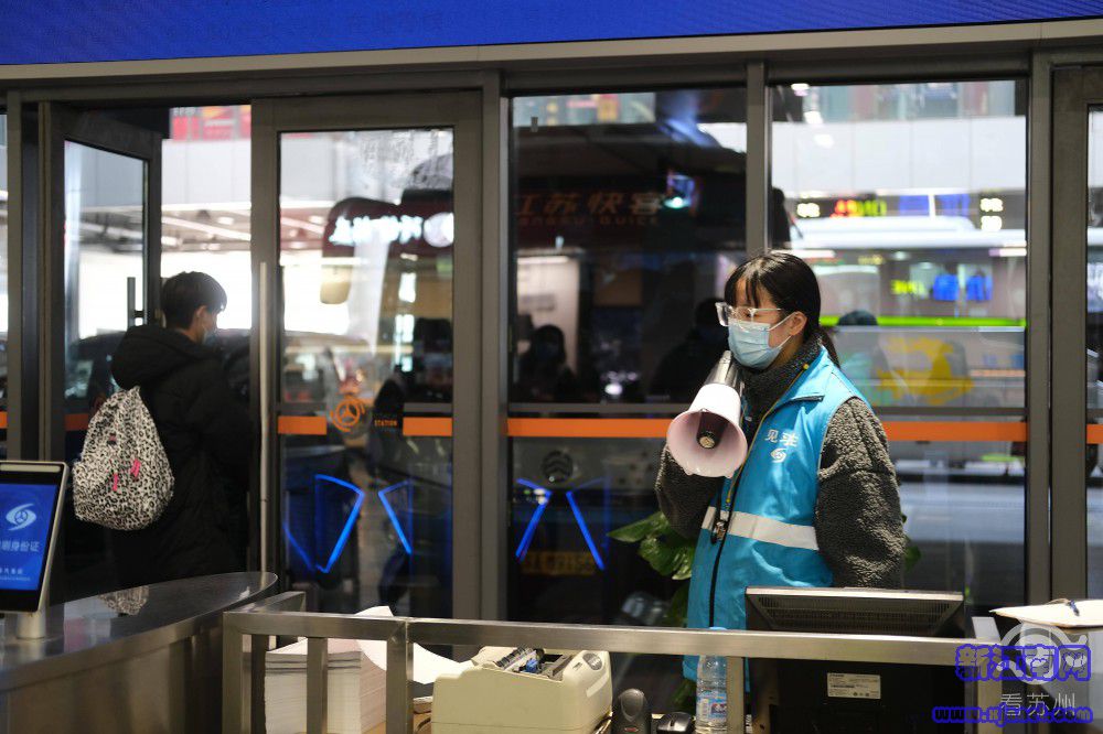 看苏州记者看到,苏州北广场汽车站已经拉起了多道“防疫阻击线”,在较为醒目的位置上都张贴了防疫通告,乘客一进入进站口,旅客都必须保持距离、佩戴好口罩,经过身份查验、体温测量合格后方可进站候车。