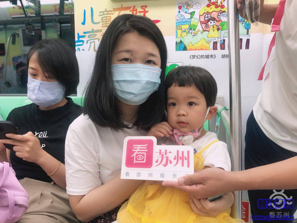 看苏州记者注意到,不少市民走进儿童友好主题的专列车厢后,都会好奇地看着一幅幅孩子们的画作,感受童心的美好。关女士带着她2岁的宝宝上车,就引导着宝宝看地上的作品,她给车厢点赞:“我们家孩子比较小,她现在可以看着这些画,能吸引她的注意力就不会哭闹,而且也能培养孩子的审美兴趣,特别好。”