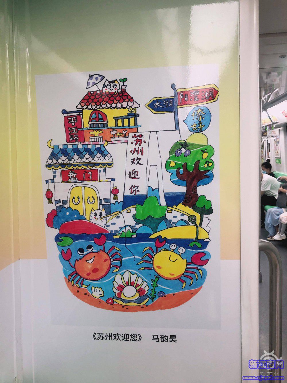 整节车厢内,地贴、扶手、车门、车厢顶部、灯箱都被彩色包围,这幅《苏州欢迎您》里画了苏州的地标建筑,湖底还有两只可爱的大闸蟹,笑着欢迎每一位来苏的人。