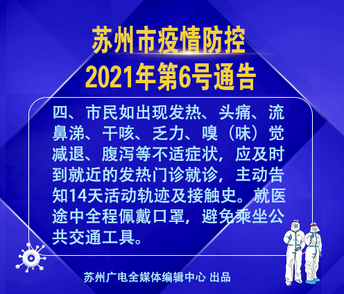 《苏州市疫情防控2021年第6号通告》提醒:市民如出现发热、头痛、流鼻涕、干咳、乏力、嗅(味)觉减退、腹泻等不适症状,应及时到就近的发热门诊就诊,主动告知14天活动轨迹及接触史。就医途中全程佩戴口罩,避免乘坐公共交通工具。