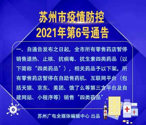 8月7日,苏州发布《疫情防控2021年第6号通告》,明确全市所有零售药店立即暂停销售退热、止咳、抗病毒、抗生素四类药品,市场监管部门也在第一时间开展线上线下同步执法检查。