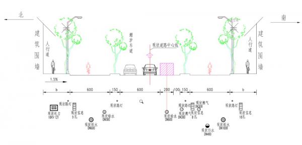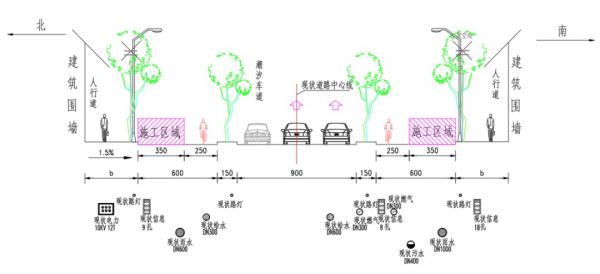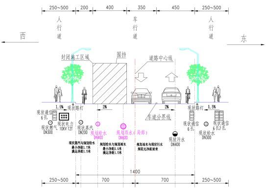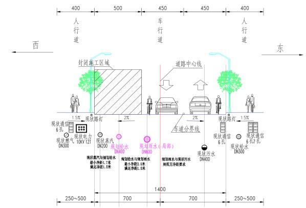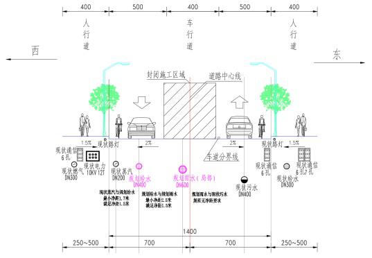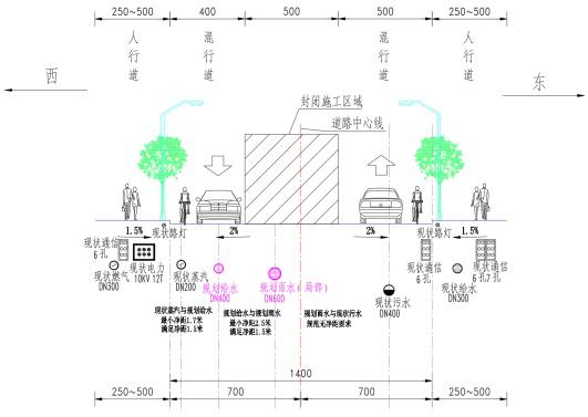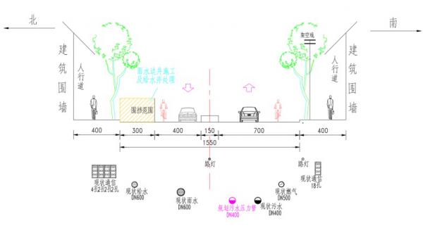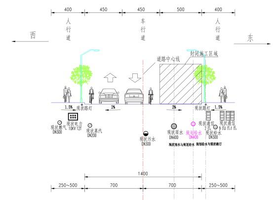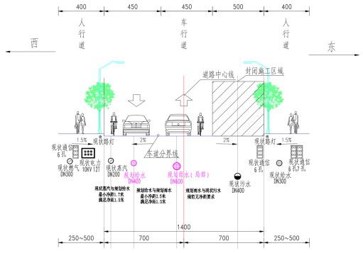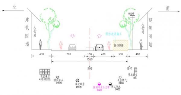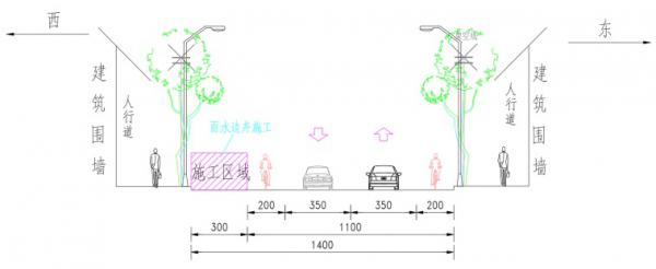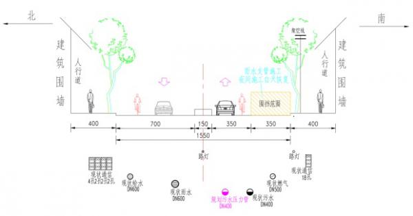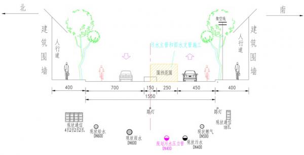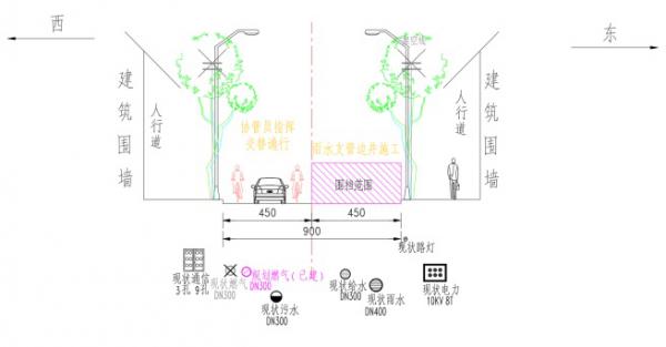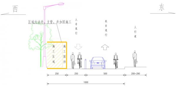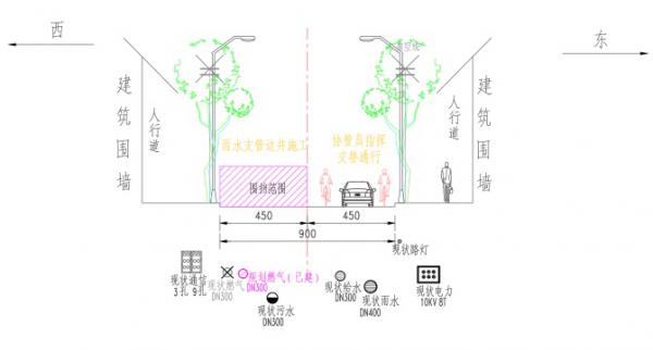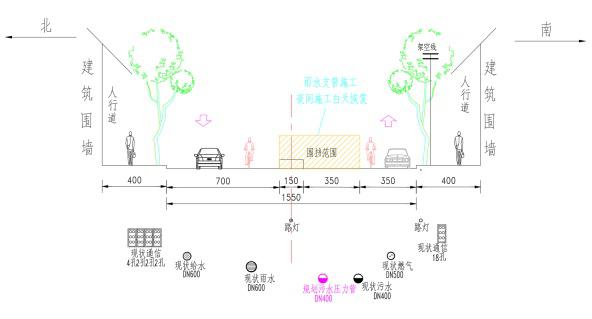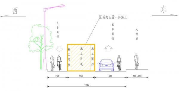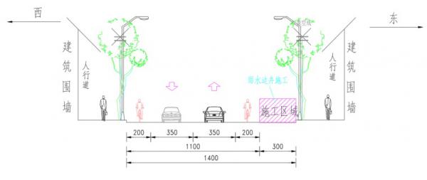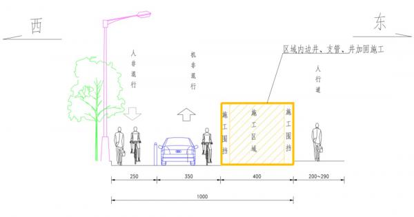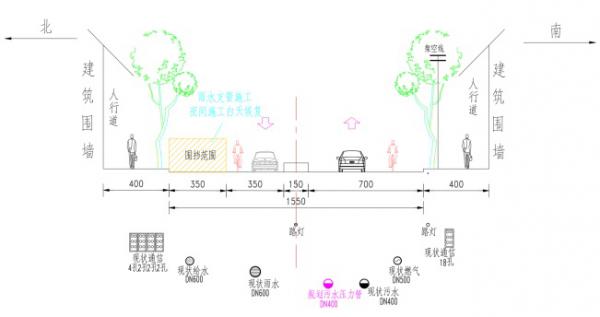 燃气管、雨水管施工占用西侧车行道,宽度约3.5米。施工期间,机动车维持现状南向北单向通行,南向北非机动车与机动车混行,车道宽约4米,北向南非机动车、行人在围挡西侧通行,通道宽约2.5米。