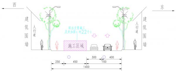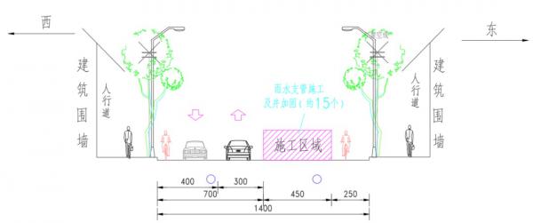 雨水边井、雨水支管及井加固施工剩余路幅,分两个阶段施工。第一阶段围挡中间车道,占车行道宽约4米,第二阶段北侧围挡剩余东半幅,南侧围挡剩余西半幅,均占车行道宽约5米,保证剩余双向车行道宽约8-10米,施工期间机动车和非机动车混行,行人正常通行。