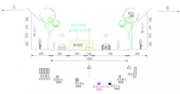 污水管施工占用中央绿化带和南侧车行道约2.5米,施工期间,西向东机动车和非机动车混行,车行道宽约4.5米,东向西机动车、非机动车维持现状,正常通行,两侧行人正常通行。