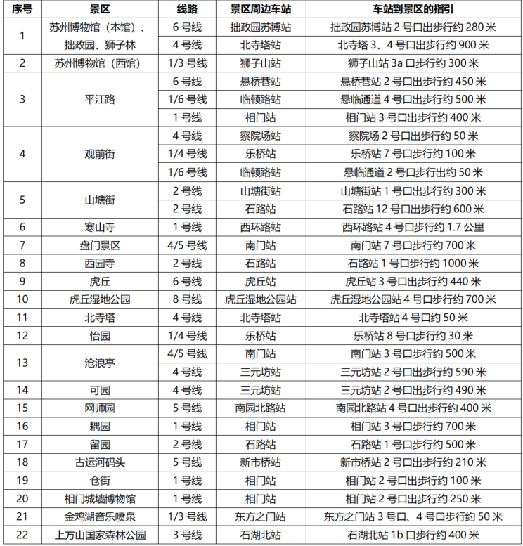 苏州火车站、苏州北站、苏州园区火车站、苏州新区火车站四大枢纽均实现与地铁的“无缝衔接”,游客可直接换乘地铁,通过地铁网络到达苏州各主要旅游景区、商圈。
