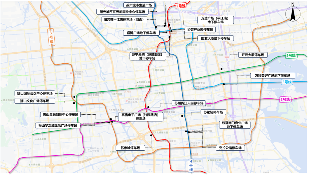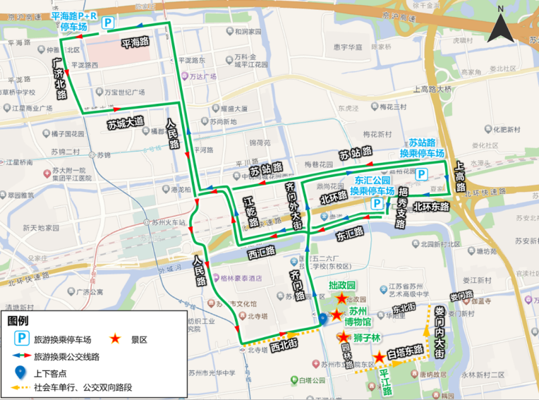 东汇公园换乘停车场(600泊位)、平海路P+R停车场(1500泊位)、苏站路换乘停车场(280泊位)服务于东北片区的拙政园、苏州博物馆、狮子林、平江路等景区,由苏州公交专线连接换乘停车场和各景区。