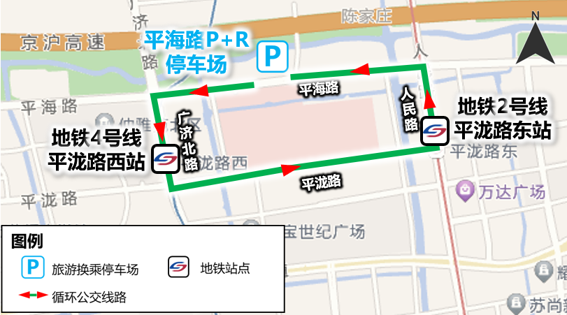 平海路P+R停车场去程线路(运行时间9:00-19:00):平海路P+R停车场—平海路—广济北路—苏城大道—人民路—西北街—齐门路(拙政园景区)。