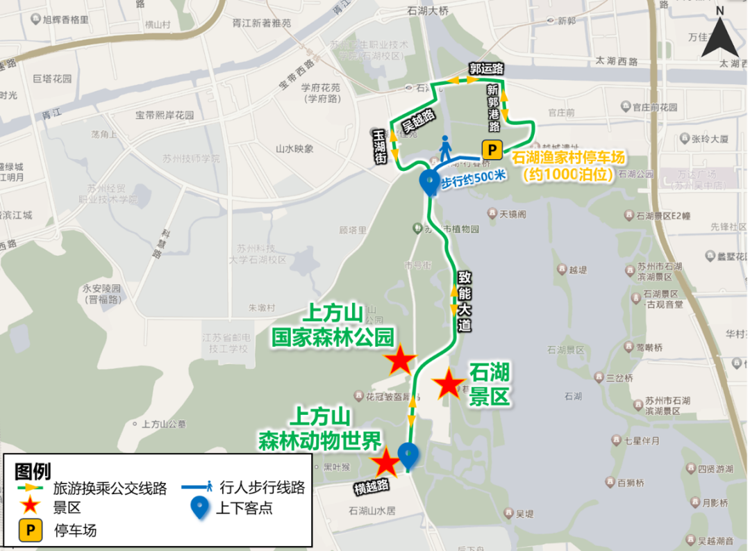 石湖渔家村停车场循环线路(运行时间8:00-18:00):石湖渔家村停车场—新郭港路—郭运路—吴越路—玉湖街—上方山国家森林公园—致能大道—上方山森林动物世界—致能大道—上方山国家森林公园—玉湖街—吴越路—郭运路—新郭港路—石湖渔家村停车场。