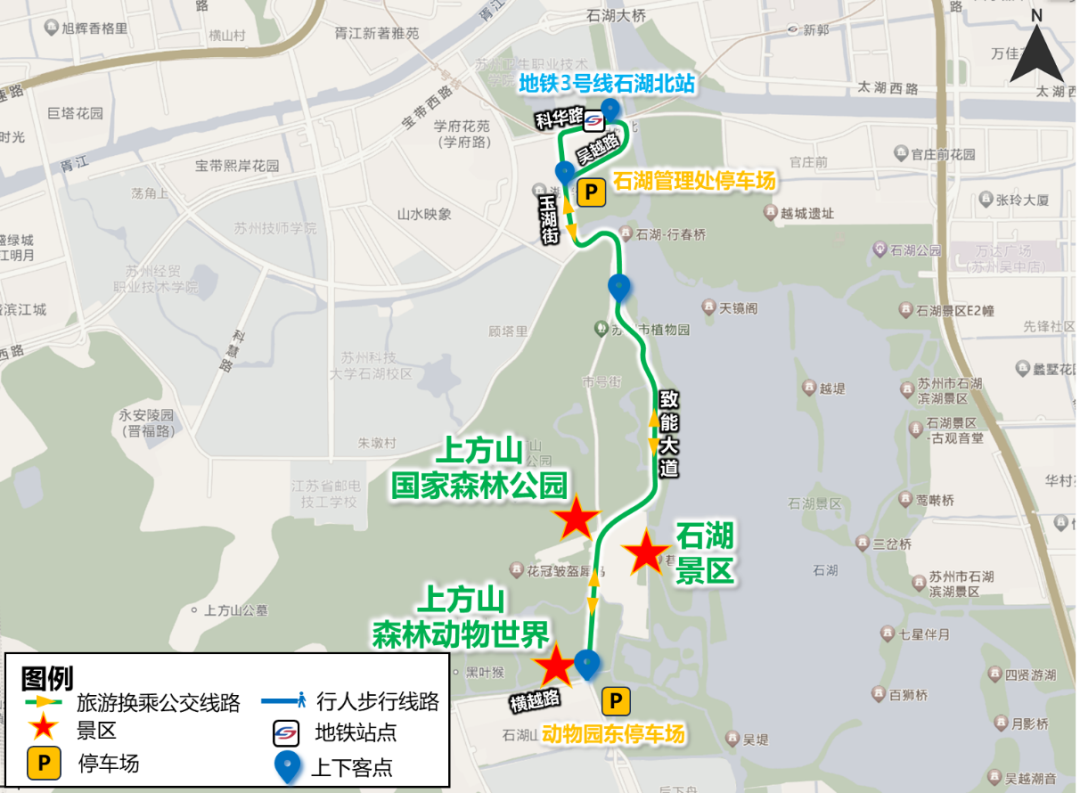 上方山景区循环线路(运行时间8:00-18:00):地铁3号线石湖北站—科华路-玉湖街-上方山国家森林公园—致能大道—上方山森林动物世界—致能大道—上方山国家森林公园—玉湖街—吴越路—科华路—地铁3号线石湖北站。