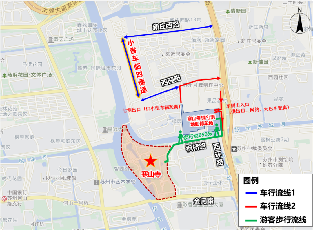 寒山寺铜勺浜地面停车场(1200泊位)服务于寒山寺,内部规划设置了旅游大巴、出租、网约车和私家车的专用停放区,到达游客可步行约650米至寒山寺景区。