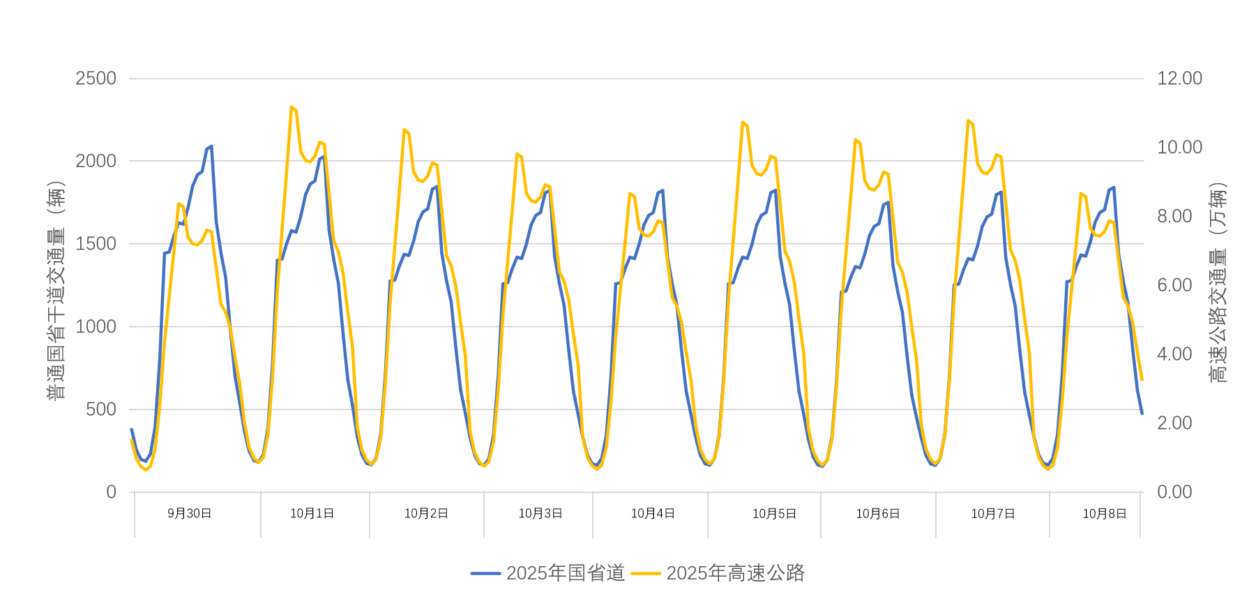普通国省道日均断面流量预计达到2.5万辆,预测同比增长2.0%,日高峰预计出现在10月1日。
