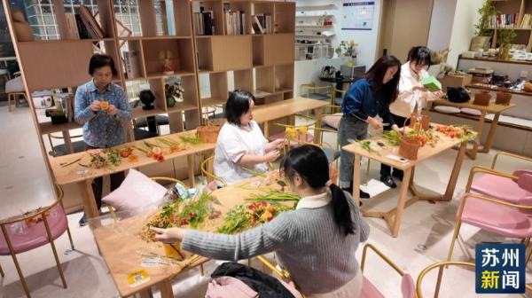 在文化服务点亮职工夜生活的同时,职工夜校也在不断优化课程体系。AI赋能、舞蹈等兴趣课程广受欢迎。入夜,在苏州市工人文化宫的花艺课上,学员们巧手修剪,将朵朵鲜花搭配出曼妙造型。这类课程正是根据企业与职工需求定制开设的。