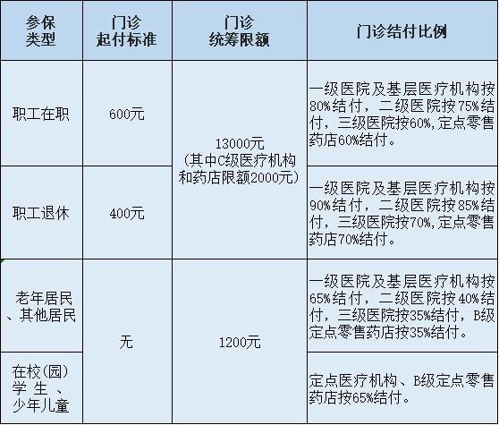 参保人员符合医疗保险结付规定的普通门诊医疗费用(不含门诊特殊病医疗费用)先通过职工医疗保险统筹基金结付。每一结算年度(每年1月至次年12月)内,在职职工(含灵活就业参保人员、领取失业保险金人员)个人自付600元、退休人员个人自付400元后,在规定限额13000元内由职工医疗保险统筹基金按比例结付,其中C级医疗机构和药店限额2000元。