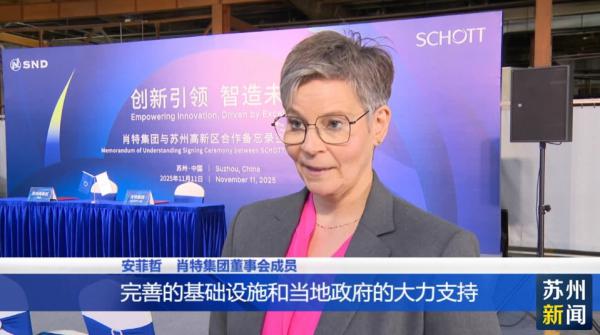肖特集团董事会成员安菲哲表示,这些年目睹了中国高科技产业的发展,基于苏州本地的高技能人才、完善的基础设施和当地政府的大力支持,肖特苏州得以快速成长。此次,在苏州投资的新项目非常重要,未来将进一步汇聚先进技术经验,强化本地研发与制造能力,拓展高端业务布局,与苏州高新区携手共赢美好未来。