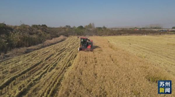 在张家港西水道天生港片区,连片稻田泛着金黄,多台收割机在田间来回穿梭,进行最后的抢收作业。
