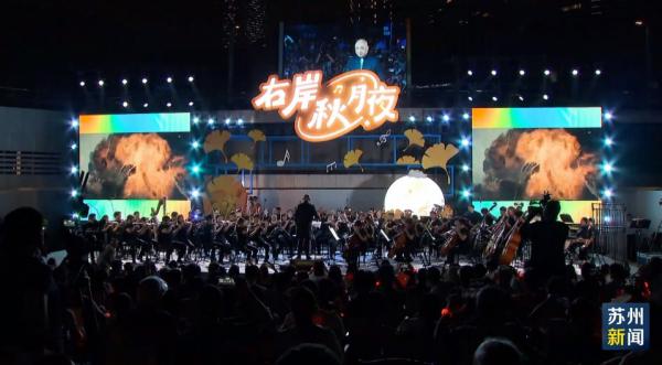 今年国庆节,苏州交响乐团走出音乐厅,在金鸡湖畔进行了一场特别的户外演出。苏州交响乐团首席指挥许忠执棒,合唱团登台演唱,伴随着秋夜的阵阵湖风,万千观众齐聚于此,跟随节奏摇摆,金鸡湖畔化身大型露天音乐会。