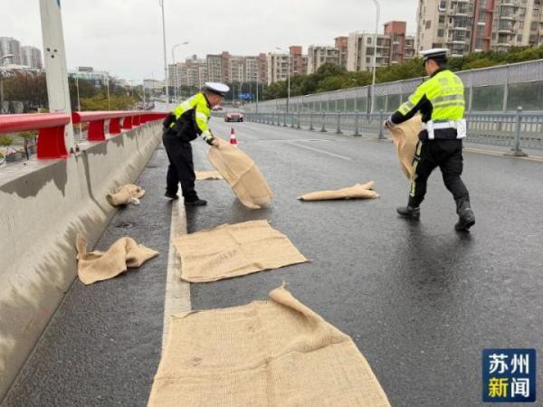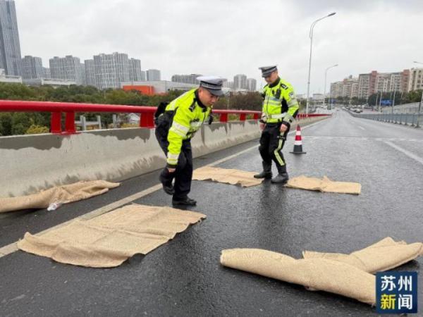 截至1月19日下午3点,苏州最低气温已经降到3.1℃,今天最低气温0℃ 局部有薄冰,苏州交警部门已经开始行动,在位于广济北路与平泷路交叉口的一座跨线桥上,交警队员正在铺设草包。