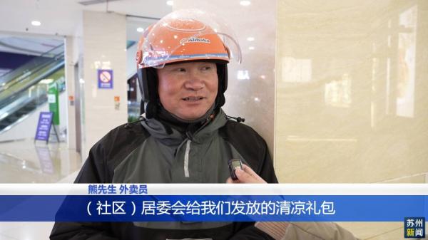 外卖员熊先生说:“在夏天的时候,社区居委会给我们发放的清凉礼包,还有地方帮我们歇歇脚,这个我感觉挺好的,挺开心的,心里感觉还是很暖的。”