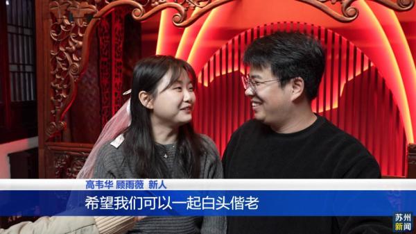 新人高韦华和顾雨薇说:“周庄古镇这边是昆山的一个特色,也是一个5A级景区,水乡文化、水乡特色都比较明显,在这边办婚礼也很有意义,希望我们可以一起白头偕老。”