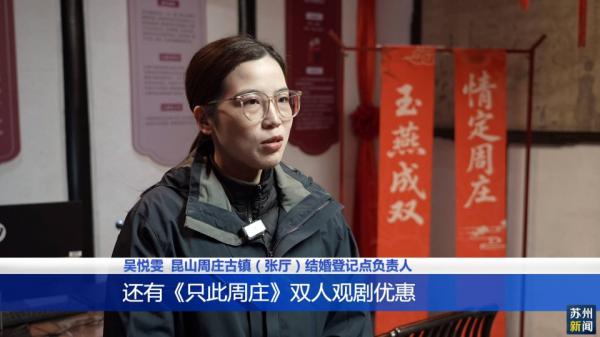 昆山周庄古镇(张厅)结婚登记点负责人吴悦雯介绍:“在这边办理登记成功的新人终身畅游周庄,还有《只此周庄》双人观剧优惠,两人同行一人免单。除此之外,新人有需要的话,周庄也为他们提供包含旅拍、游船、晚宴等服务,解锁“婚登+摄影+蜜月观光”的甜蜜体验。”