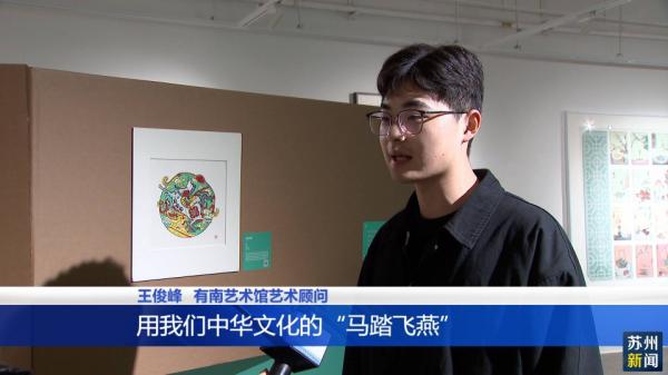 有南艺术馆艺术顾问王俊峰说,“像这个作品它的名字叫作‘马到功成’,中间的这个马的符号,用中华文化的‘马踏飞燕’,它又是一个文物的形象,像它外面的话,是一个拉满的弓,那它的一个意思就是说蓄势待发、一击即中。”