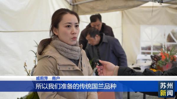 商户戚莉萍介绍,因为临近过年了,所以准备了传统的国兰品种都是带有花苞的,可以看见以这个国兰作为背景,符合苏州盆景里面对于苏州园林的一个缩影,又是一个岁朝清供,还是属于比较清幽雅致的。