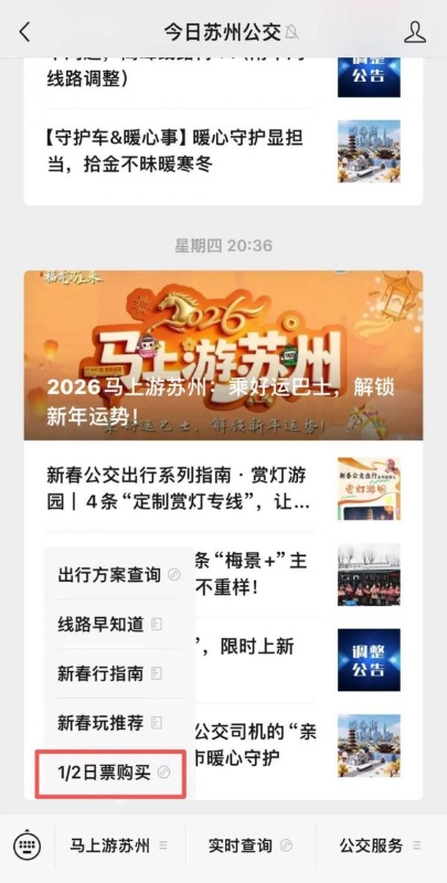 “今日苏州公交”公众号:点击底部菜单“马上游苏州”-“1/2日票购买”;