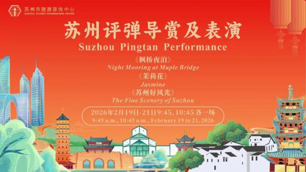 领略苏州评弹艺术,展现江南文化魅力,表演《枫桥夜泊》《茉莉花》《白蛇传·游山塘》等曲目。本项目为免费公益活动,无需预约。请按时前往,座位有限,先到先得。