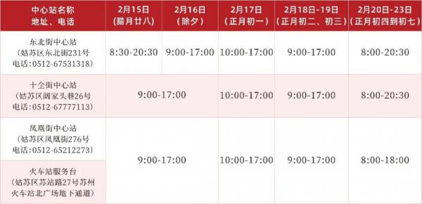 为更好满足游客市民需求,春节假期(2026年2月15日-23日),苏州市旅游咨询中心各中心站将延长开放服务时间,具体如下: