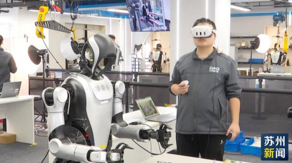 在吴江智训未来的训练场,工作人员正通过VR设备训练机器人完成抓取任务。该训练场年均可产出超4万小时多模态动态数据,已交付数据超7000小时。