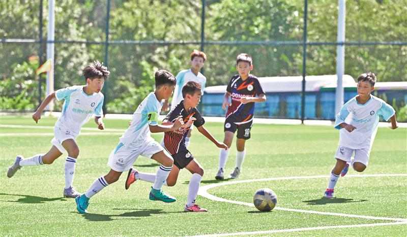 16日“苏超”第九轮无锡队与徐州队的比赛,迎来了一群特殊的小客人——18位贵州省榕江县大山里的足球娃。那里是“村超”发源地,小球员在陶都以球会友,不仅在绿茵场上和宜兴的小朋友切磋球技(右图),还在绿茵场外看到了更大的世界。