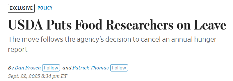 新华社北京9月23日电 据美国《华尔街日报》22日报道,美国农业部已让一个由联邦经济学家和研究人员组成的团队“无限期休假”,该团队负责一项关于美国粮食不安全问题的政府调查。此前,美国农业部宣布停止2025年度美国《家庭粮食安全报告》数据收集和发布工作。