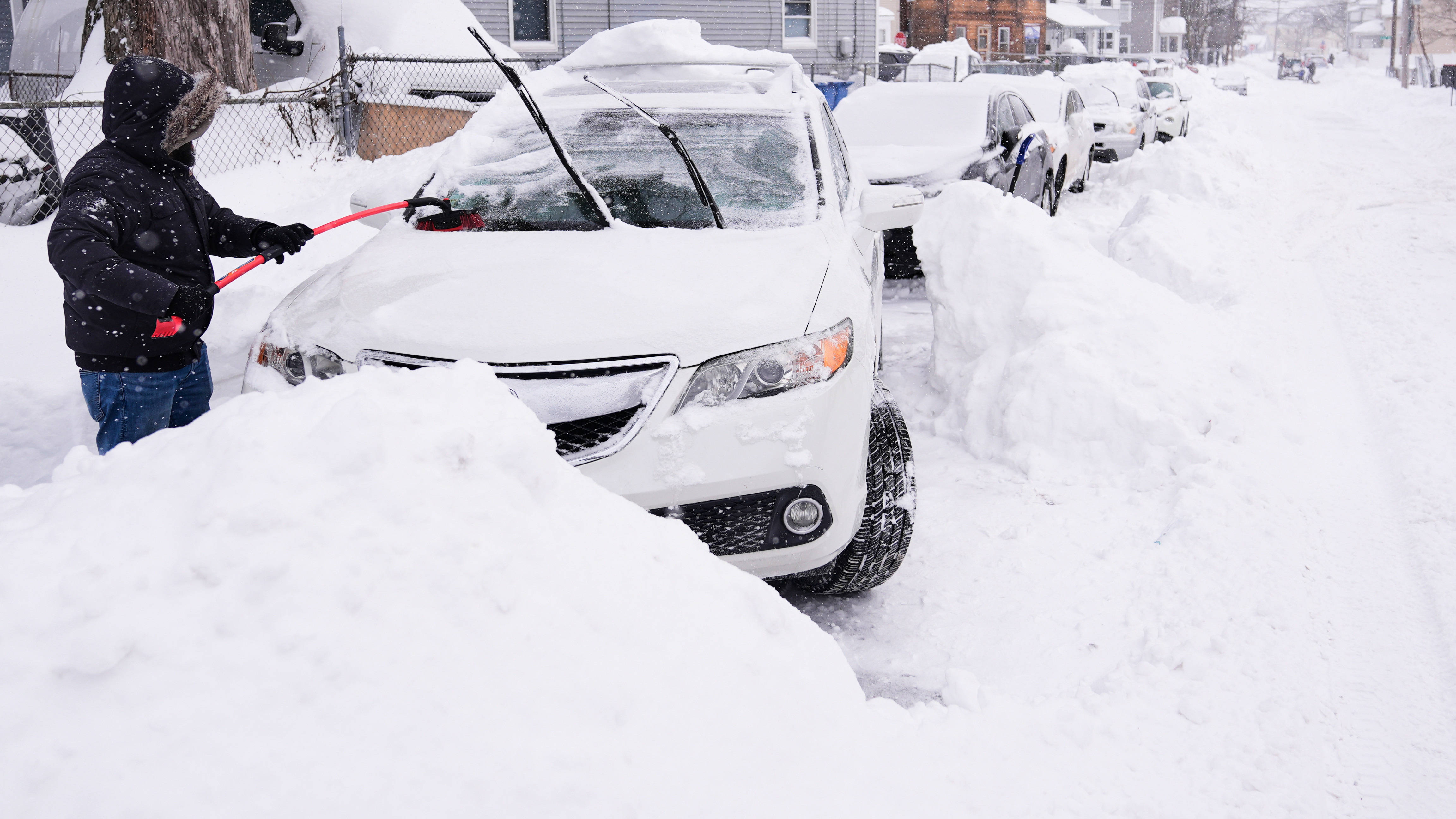 1月26日,在美国马萨诸塞州劳伦斯,一名男子清除车窗上的积雪。 新华社/美联
