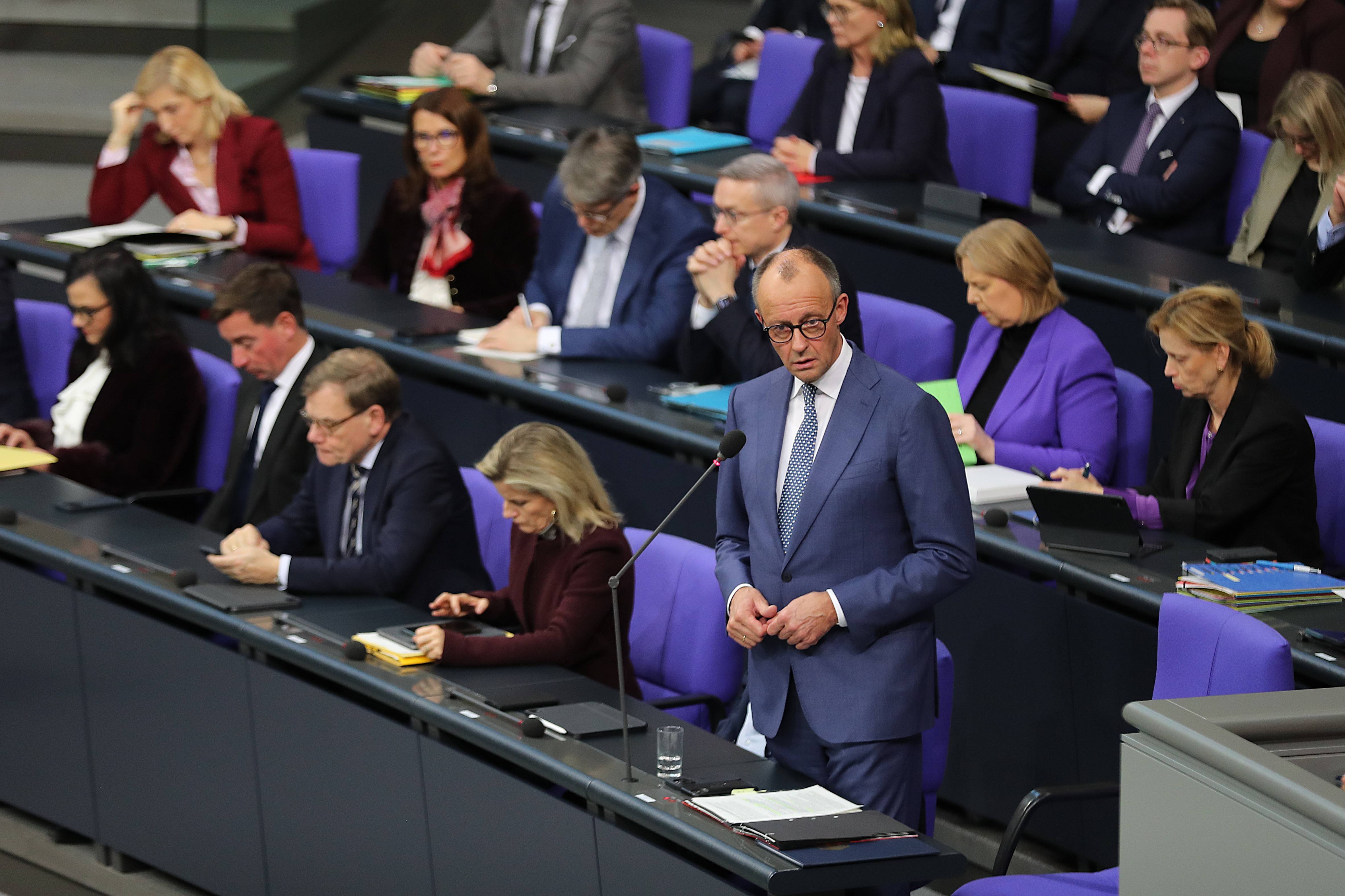 2025年12月17日,德国总理默茨(前排右一)在位于柏林的德国联邦议会接受例行问询。新华社记者杜哲宇摄