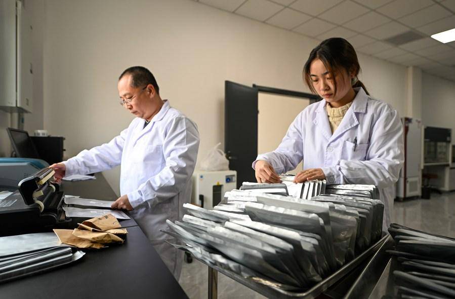在天津市农业科学院种质资源与生物技术研究所,科研人员对待入库种质资源进行封装。新华社记者 孙凡越 摄