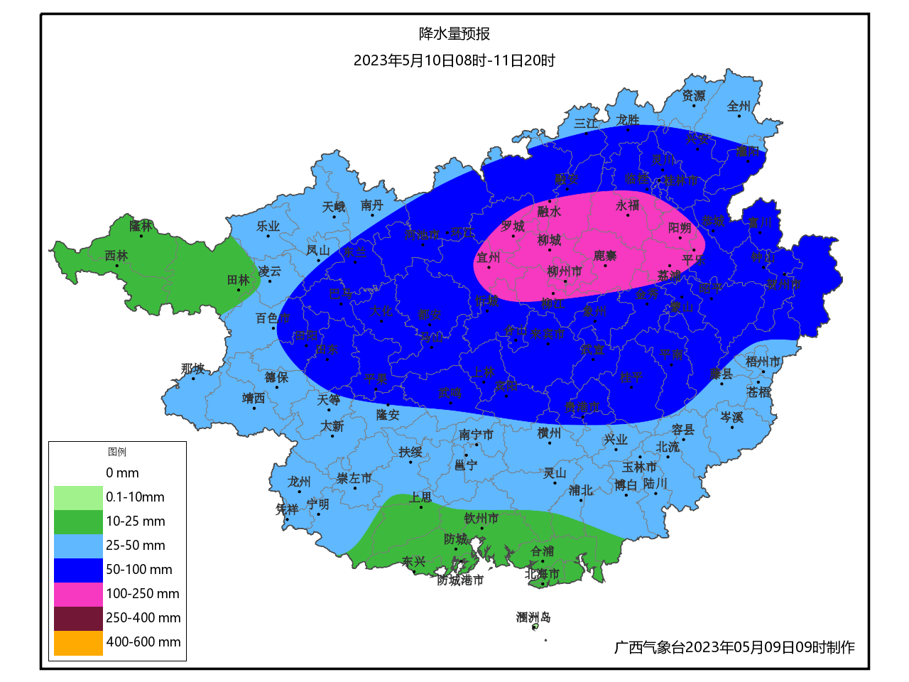 据气象部门预测,广西桂北、桂东及沿海地区本轮降雨过程将达50至150毫米、局地200毫米以上,最大小时雨强为40至60毫米。广西气象台于5月10日12时发布暴雨蓝色预警。