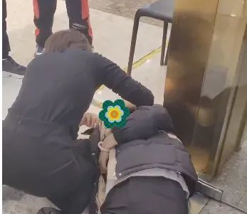 邹茜快速俯下身,双膝跪在地上,对倒地的女子进行身体评估,发现心跳、呼吸都正常,只是四肢抽搐、呼之不应。