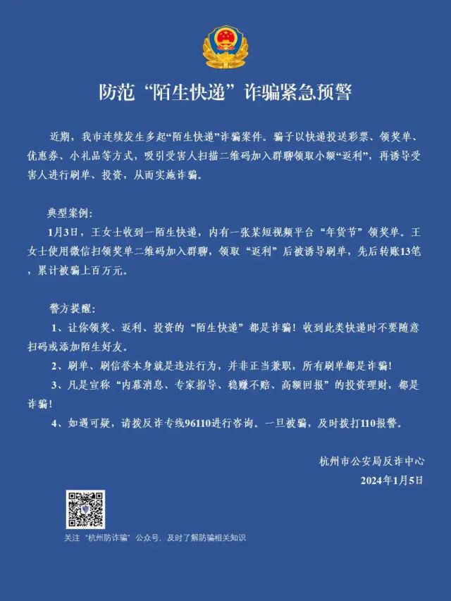 杭州公安消息 近期,我市连续发生多起“陌生快递”诈骗案件。杭州市公安局反诈中心发布紧急提醒。XV0新江南网|江南区域知名综合门户网