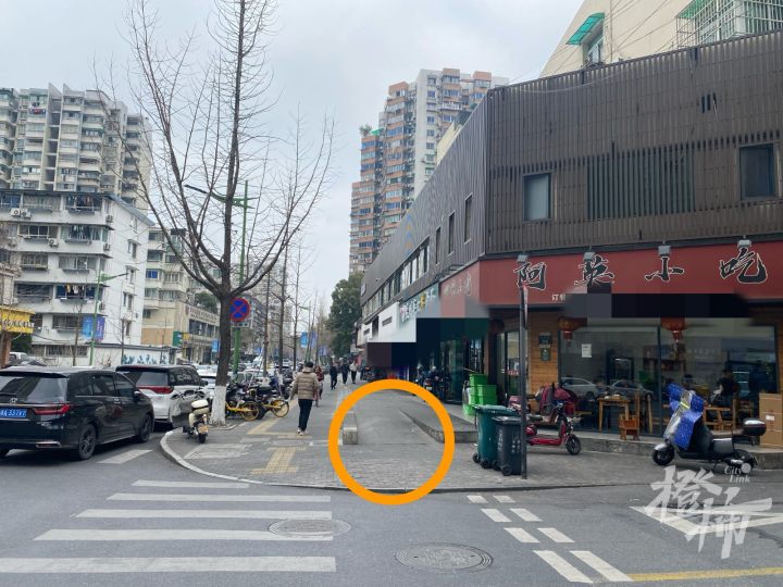 橙柿直通车记者在附近走了一圈,看到十字路口从行车道往沿街商铺之间的通道上,通常都有设计相对比较平缓的坡道。