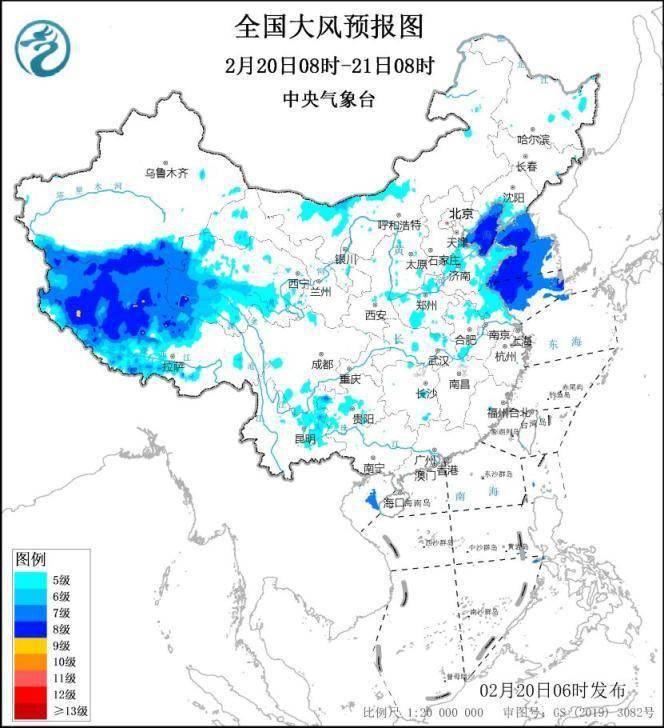预计,2月20日08时至21日08时,西藏中西部、青海中南部、内蒙古中西部、辽宁南部、华北东南部、黄淮西部和东部、江淮西部和北部等地的部分地区有5~7级风,阵风8~9级。渤海、渤海海峡、黄海大部海域将有7~8级,阵风9~10级的大风。