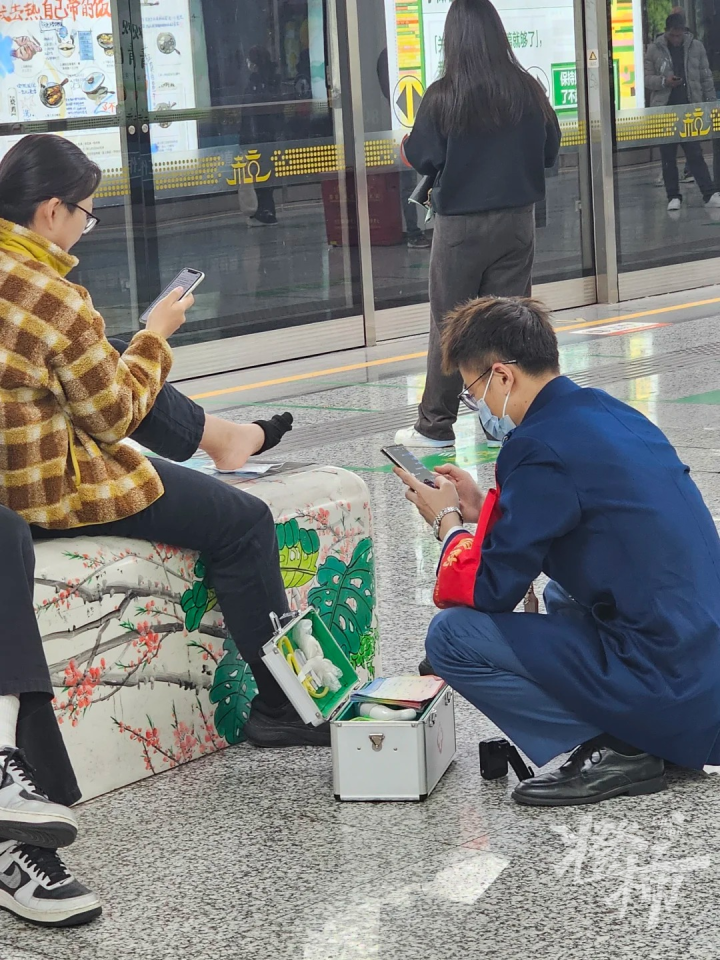 接到站台同事报送后,值班站长徐涛第一时间携带冰袋、云南白药等医疗用品赶至现场。