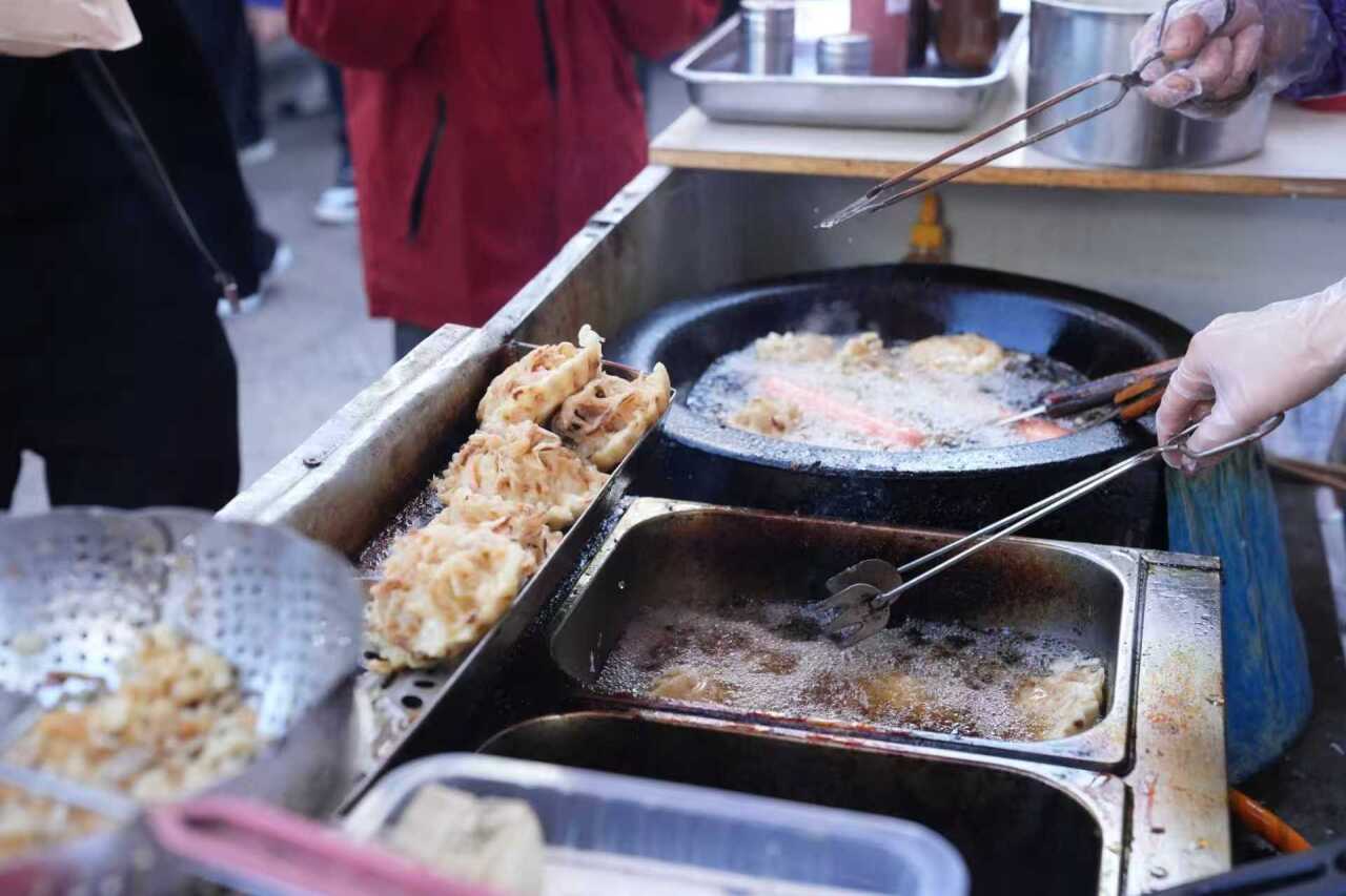 而小红车刚出锅的萝卜丝饼藏着朴实的烟火气。面糊在热油里慢慢舒展,从素净浅白,烤成通体金黄的酥脆模样。轻轻咬下,外皮咔嚓作响,内里绵软鲜香。金黄与温润、酥脆与软糯,在唇齿间散开的滋味里蕴藏着阿姨6年的精湛家常手艺。