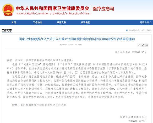 根据《“健康中国2030”规划纲要》《“十四五”国民健康规划》和《中国防治慢性病中长期规划(2017-2025年)》总体部署,2025年我委组织专家对第六批建设的国家慢性病综合防控示范区(以下简称示范区)进行评估。经材料审核和现场评估,确定北京市大兴区等93个县(市、区)为国家慢性病综合防控示范区(名单见附件)。