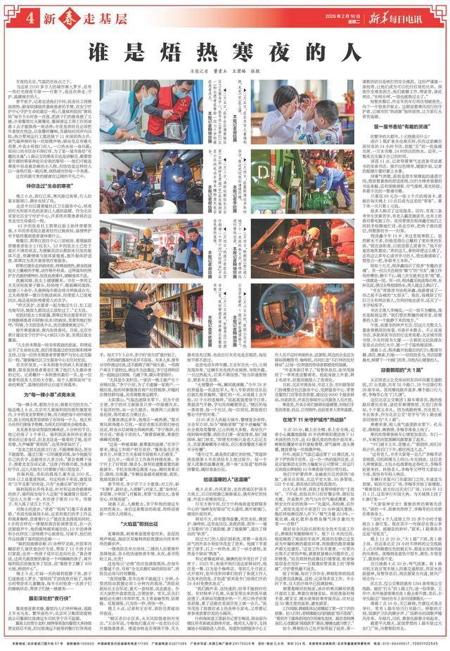 春节前夕,记者走进他们中间:医务社工将精油搓热,俯身轻揉临终重病患者的手臂,在安宁疗护中心守护生命的最后一程;儿童福利院的“黄妈妈”每半个小时查一次夜,把孩子们的被角掖了又掖;小巷餐馆灯火阑珊处,餐厨清运工得工作到凌晨3点才能换得一街洁净;冬夜里消防员必须把外套放在枕边,以备警铃骤响,用最短时间冲向凶险;热力管网运行工爬进地下11米深的热力井,屏气凝神倾听每一丝细微声响;驿站里总有暖光亮着,外卖小哥推门而入,一口热水祛一身风霜;胡同口的书店舍不得打烊,为了留一屋书香给“有趣的灵魂”;1路公交的乘务员也是讲解员,载着想看升旗的乘客奔赴长安街的黎明……他们可能是寒夜中容易被忽略的小人物,但恰恰是这样的人以一身热汗抵一路风寒,焐热城市的每一个角落。